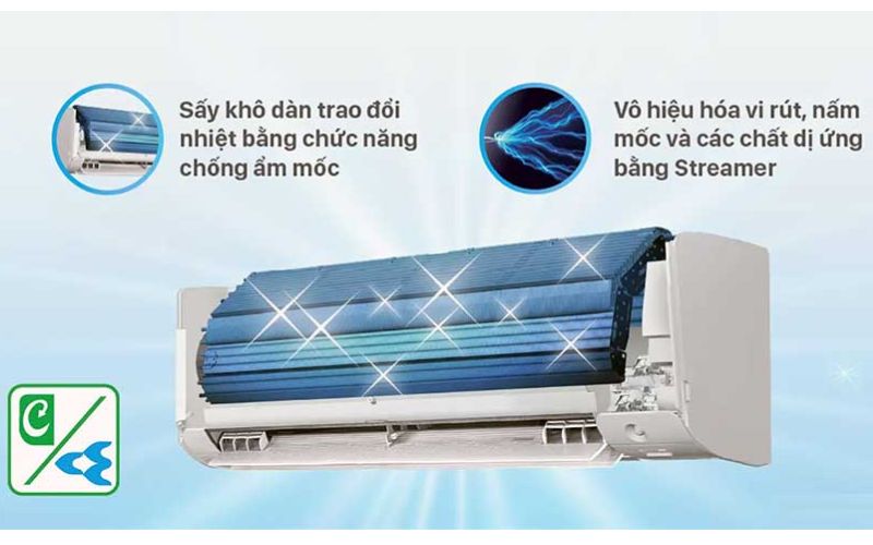 Thuộc phân khúc tiêu chuẩn nhưng vẫn tích hợp được nhiều công nghệ hiện đại như: tính năng lọc khí Streamer và Phin lọc Enzyme Blue tích hợp PM2.5 không chỉ loại bỏ đến 99.9% vi khuẩn mà còn ngăn ngừa mùi hôi và nấm mốc trên dàn lạnh. Sản phẩm có khả năng tiết kiệm điện vượt trội với công nghệ Inverter và máy nén Swing (CSPF đến 5.38)